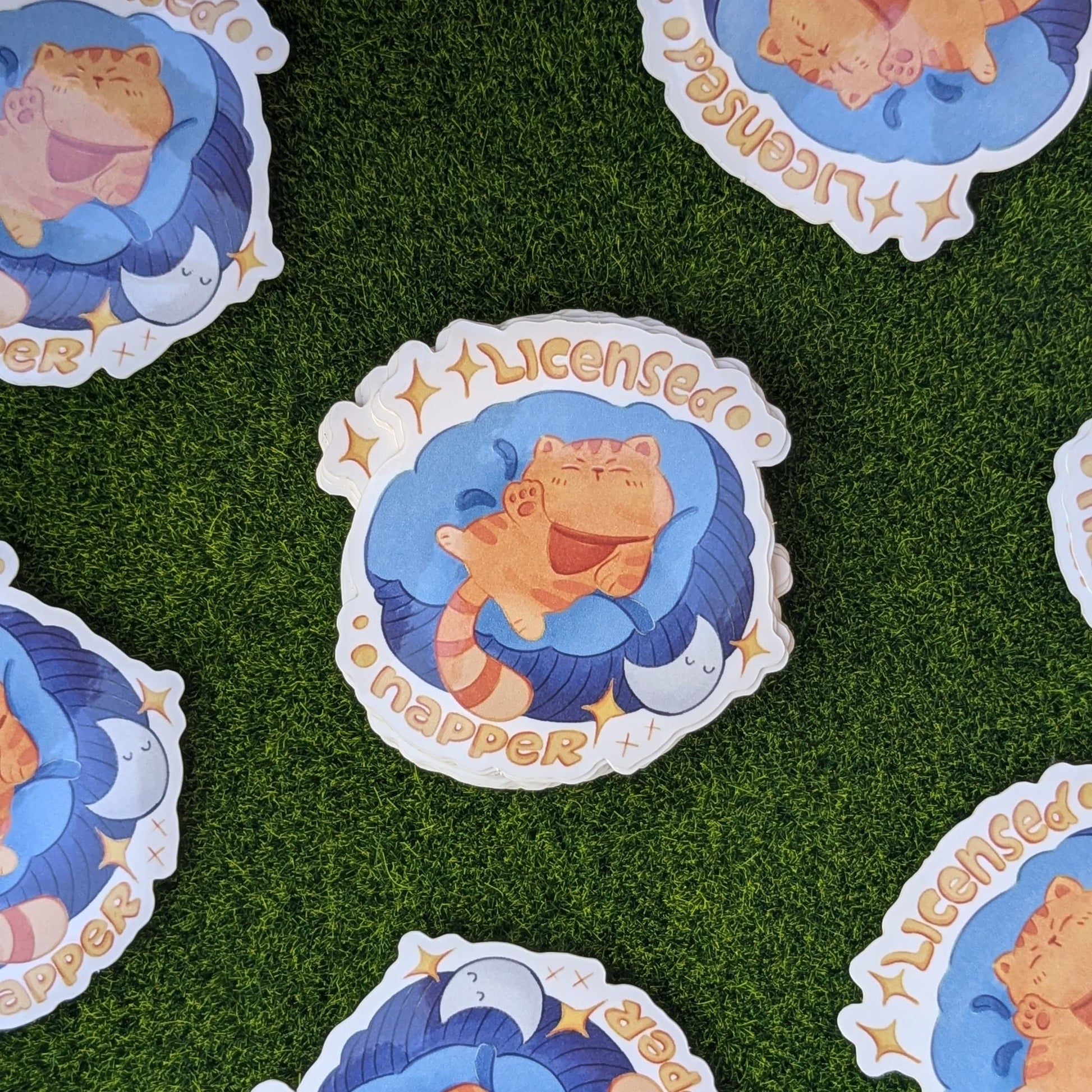 Featuring a blissed-out orange tabby snoozing on a dreamy midnight-blue cloud, this sticker is your official excuse to cancel plans and curl up in a blanket burrito. With a sprinkle of sleepy stars and a very understanding moon, it’s the perfect reminder that rest is absolutely productive.